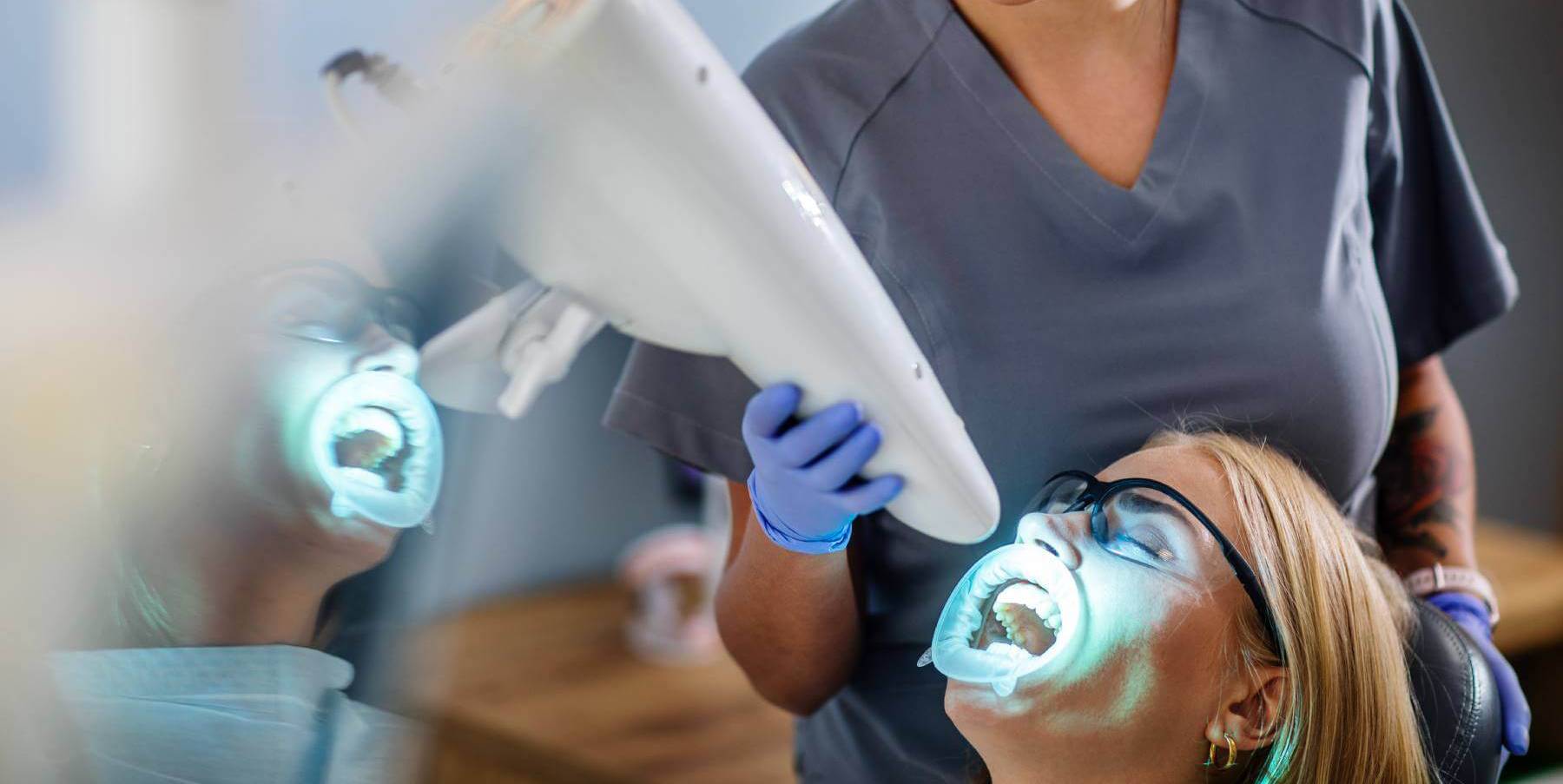 - Wybielanie lampą + nakładki w domu – opcja rekomendowana w przypadku znacznych przebarwień (według skali Vita). Zabieg trwa około 1 godziny. W tym czasie higienistka stomatologiczna precyzyjnie aplikuje żel wybielający na wargową powierzchnię zębów przednich. Błona śluzowa zostaje dokładnie zabezpieczona przed kontaktem z preparatem. Aktywację żelu wspomaga światło specjalistycznej lampy LED. Po jednej wizycie możliwe jest osiągnięcie zauważalnej poprawy koloru zębów, a dalsze stosowanie nakładek przez kilka dni w domu znacząco wzmacnia uzyskany efekt.